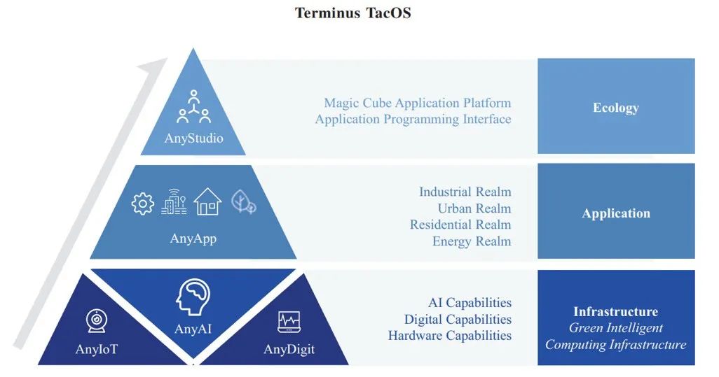 According to China Insights Consultancy, TacOS is one of the earliest public domain AIoT operating systems in Asia to support all-scenario applications in public domain spaces. "TacOS uses a layered design, allowing for deployment as an integrated platform or flexible modular deployment of subsystems, achieving scalable implementation of the platform. The overall technical architecture of TacOS consists of five layers: intelligent computing IoT, global digitization, general intelligent agents, all-scenario applications, and developer platforms.