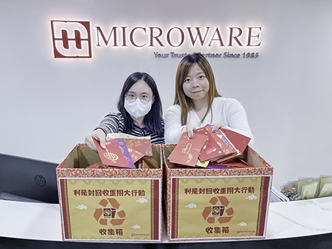 Microware Group has always been willing to contribute to environmental protection and advocate green festivals. This year, we actively supported the "Lai See Reuse and Recycle Program" organised by Greeners Action by helping to collect the intact red packets from our colleagues and send them to the organisers for further processing, so that they can be reborn and reduce waste at source.
